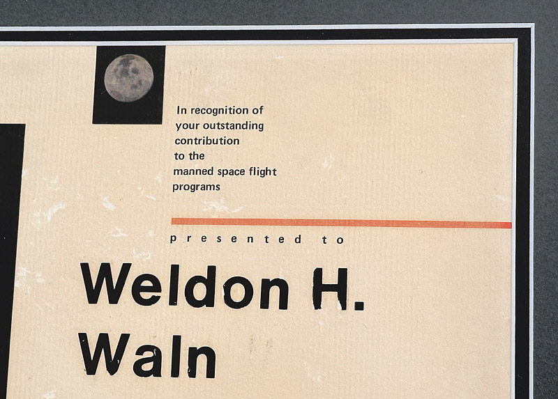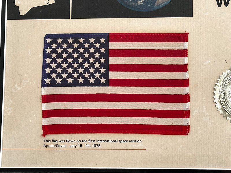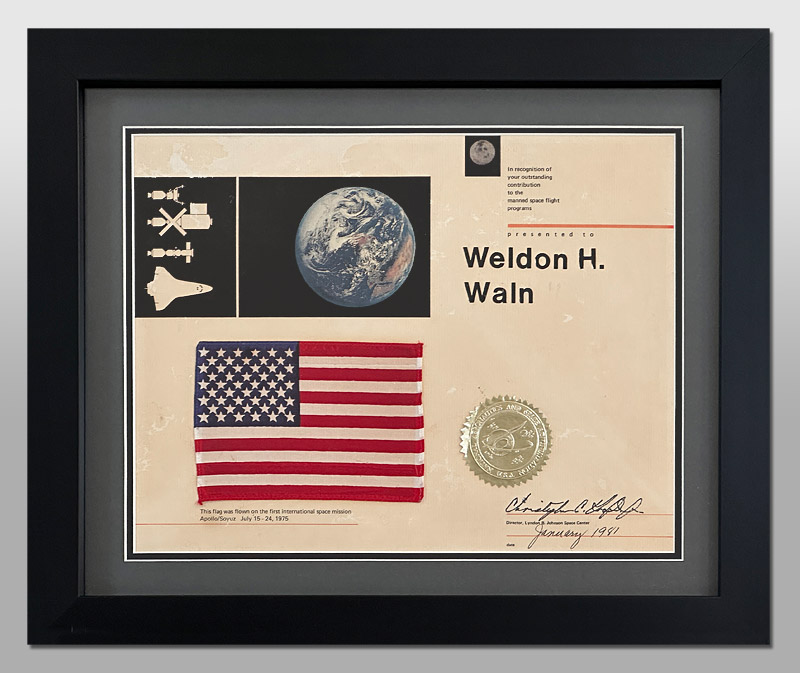 The certificate reads, "This flag was flown on the first international space mission Apollo/Soyuz July 15-24, 1975" and "In recognition of your outstanding contribution to the manned space flight programs" - Christopher C Kraft