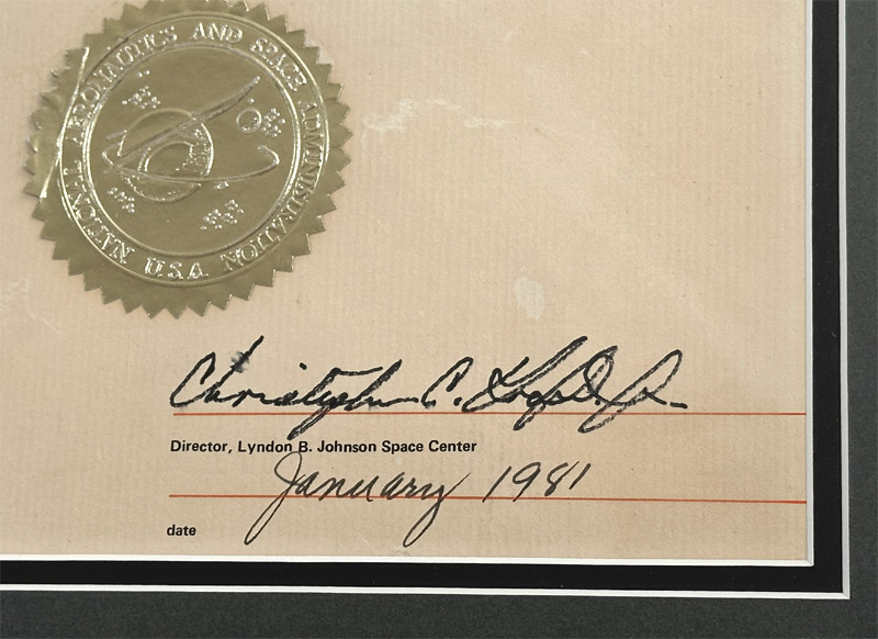 The flag is affixed to a certificate measuring 14 x 11 inches which is hand signed by Christopher C Kraft, the legendary flight director and director of the Johnson Space Center.