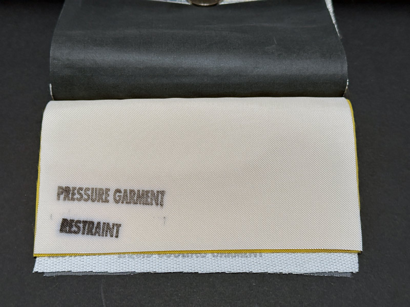 The next layer is the Pressure Garment Restraint Layer which prevents the suit from puffing up under the 4.3 psi oxygen pressure maintained by the PLSS backpack.