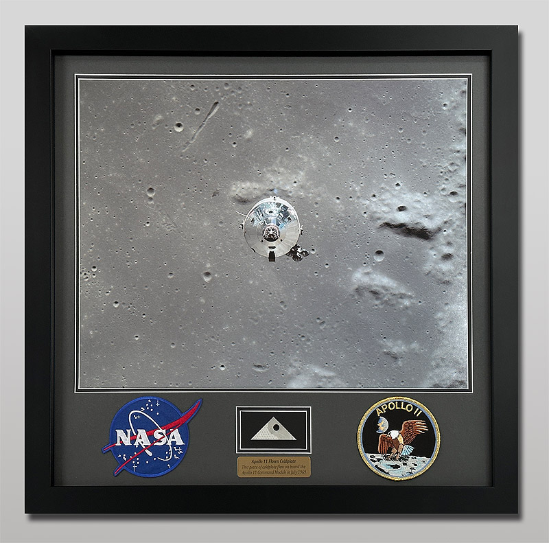 It was framed using archival materials below a stunning 20x16 inch photo of the Apollo 11 Command Module in lunar orbit and a brass plaque which reads, "Apollo 11 Flown Coldplate - This piece of coldplate flew on board the Apollo 11 Command Module in July 1969"
