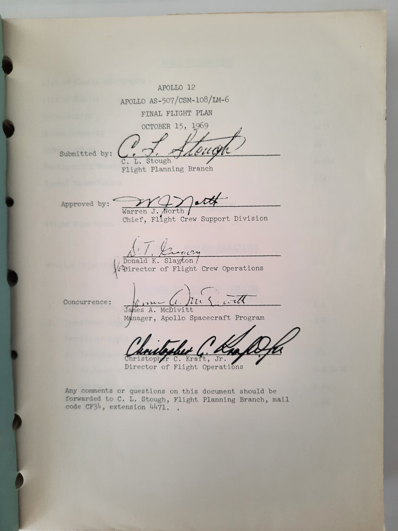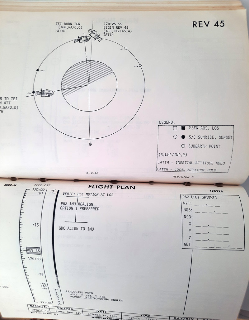 A 312 page Apollo 12 Final Flight Plan, 8" x 10.5", five-hole punched, string-bound. A flight plan, such as this, provides the crew and Mission Control with a quick reference to the events planned during a spaceflight as well as a wealth of other miscellaneous information
