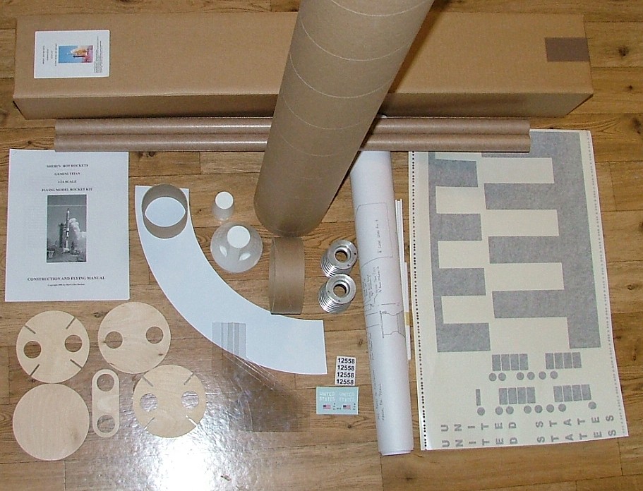 | IF YOU HAVE BEEN LOOKING FOR A LARGE SCALE DETAILED MEDIUM/HIGH POWERED GEMINI TITAN KIT THEN THIS IS FOR YOU.!! THIS KIT HAS NUMEROUS OUTSTANDING FEATURES: LOTS OF PREFAB PARTS MAKE THIS KIT AN EASY QUICK BUILD: 1. 2 PIECE SOLID RESIN CAPSULE 2. 1/8 INCH THICK WALLED HEAVY DUTY MAIN BODY TUBE 3. PRECUT GLASSINE 29 MM HEAVY DUTY HIGH QUALITY MOTOR TUBES-2 4. 1/4 INCH BIRCH PLY CNC CUT CENTERING RINGS 5. CNC CUT 1/8 INCH CLEAR LEXAN FINS THAT SIMPLY SLIDE IN AND BOLT ON. 6. LIGHTWEIGHT MACHINED ALUMINUM NOZZLES!!! NOZZLES STAY ON FOR FLIGHT AND ACT AS POSITIVE MOTOR RETENTION. 7. LARGE VINYL WRAP FOR MAIN BODY GRAPHICS 8. WATERSLIDE DECALS FOR GEMINI CAPSULE 9. FULL SIZE PLANS AND COMPREHENSIVE CONSTRUCTION AND FLYING MANUAL. 10. PROVEN DESIGN WITH NUMEROUS HOURS OF DESIGNING AND FLIGHT TESTING. 11. DESIGN TO FLY ON "G" SIZE MOTORS SUCH AS THE G-80-4T BY AEROTECH. NO CERTIFICATIONS OR PERMITS REQUIRED TO PURCHASE. READILY AVAILABLE ON LINE. 12. MODEL REACHES ALTITUDE OF 550-600 FEET ON 2 G80-4T MOTORS!!!! 13. NO OTHER KIT OFFERS THESE CUSTOM FEATURES. 14. OVERALL HEIGHT IS ALMOST 53 INCHES |