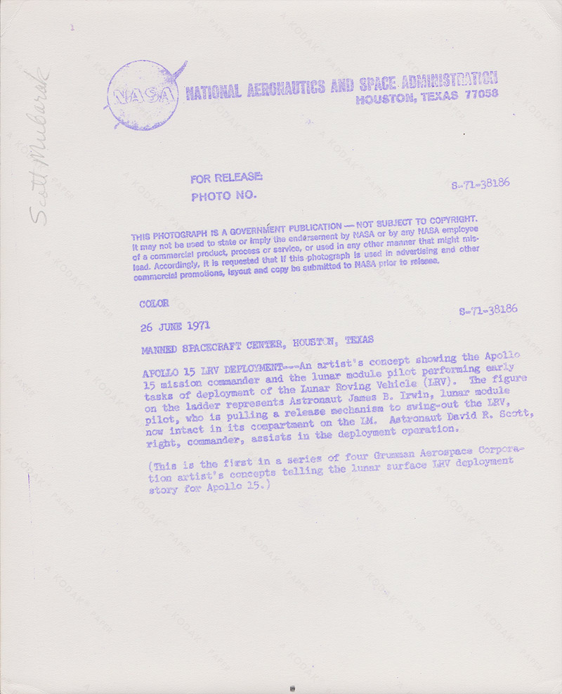 Rear side reads: "26 JUNE 1971 - S-71-38186 - MANNED SPACECRAFT CENTER, HOUSTON, TEXAS - APOLLO 15 LRV DEPLOYMENT An artist's concept showing the Apollo 15 mission commander and the lunar module pilot performing early tasks of deployment of the Lunar Roving Vehicle (LRV). The figure on the ladder represents Astronaut James B. Irwin, Lunar module pilot, who is pulling a release mechanism to swing out the LRV, now intact in its compartment on the LM. Astronaut David R. Scott, right, commander, assists in the deployment operation. (This is the first in a series of four Grumian Aerospace Corporation artist's concepts telling the lunar surface LRV deployment story for Apollo 15.)