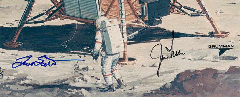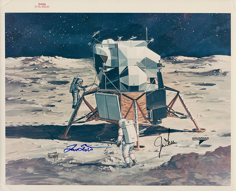 10x8 inch artist's concept of Apollo 15 LRV deployment signed by Dave Scott and Jim Irwin.