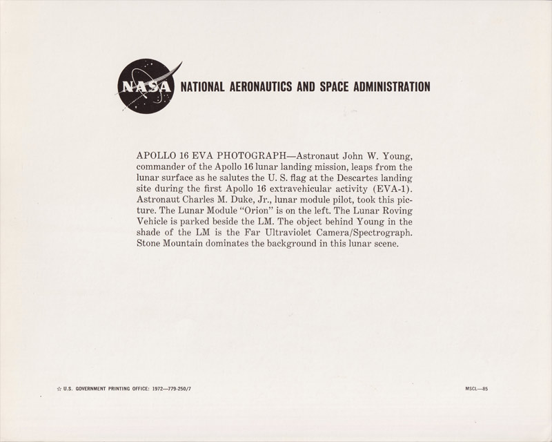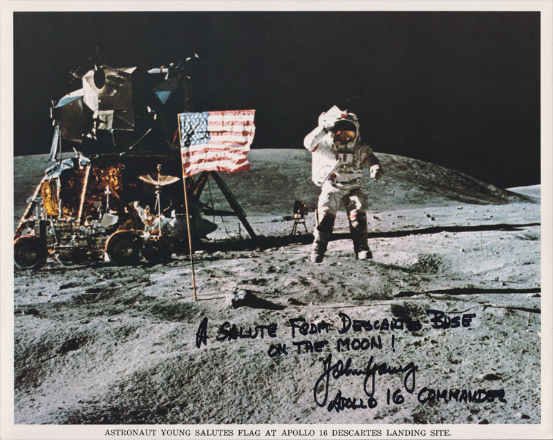 10x8 inch NASA litho showing John Young performing his famous 'Jump Salute' in 1/6th gravity, signed boldly by Young in black pen. 'A Salute from Descartes Base On The Moon! John Young Apollo 16 Commander"
