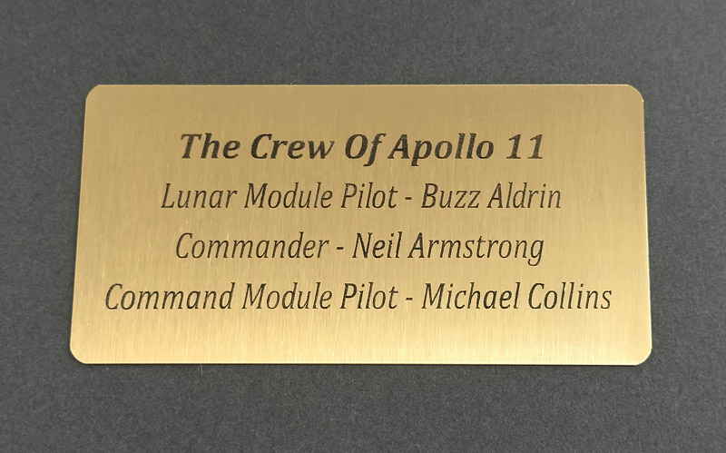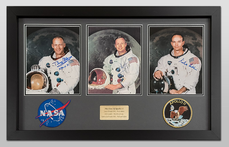 This piece contains one of the key items of space collecting, an un-personalised Signed Neil Armstrong WSS (White Space Suit) Litho Portrait. Along with similar un-personalised WSS photos from fellow Apollo 11 Astronauts, Mike Collins and Buzz Aldrin. Each portrait is 8x10 inch and has been hand signed by the astronauts with matching blue pens. The frame is supplied with UV protective Acrylic glass and uses Acid free mounts. Included are two 4 inch AB Emblem Patches and a brass plaque