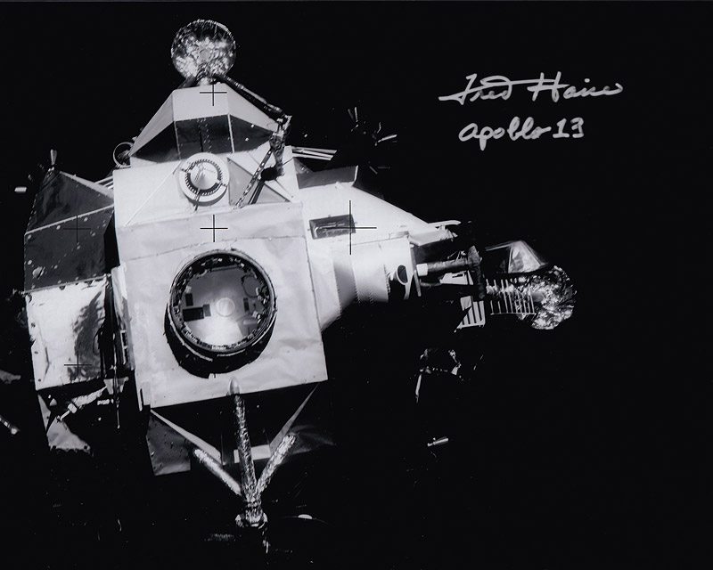 10x8 inch glossy photo, showing the Apollo 13 Lunar Module Aquarius after jettison from the crippled Command Module. Hand signed by Fred Haise in silver pen with, 'Fred Haise Apollo 13'