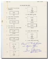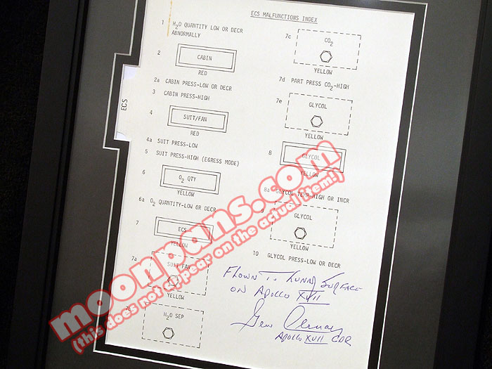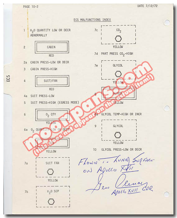 This Apollo 17 Flown page comes form the LM Malfunction Procedures Manual. This is a trouble-shooting "yes-no" flowchart for every major system aboard Lunar Module "Challenger".It is the index page for the Environmental Control System, which deals with vital systems aboard the LM such as Oxygen and CO2 levels. And has been hand signed and inscribed by Apollo 17 Commander Gene Cernan, "Flown To The Lunar Surface on Apollo xvii - Gene Cernan Apollo xvii CDR"