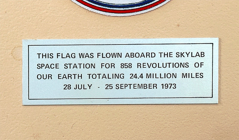 Also affixed to the presentation is a small plaque which reads, "THIS FLAG WAS FLOWN ABOARD THE SKYLAB SPACE STATION FOR 858 REVOLUTIONS OF OUR EARTH TOTALING 24.4 MILLION MILES - 28 JULY - 25 SEPTEMBER 1973 "