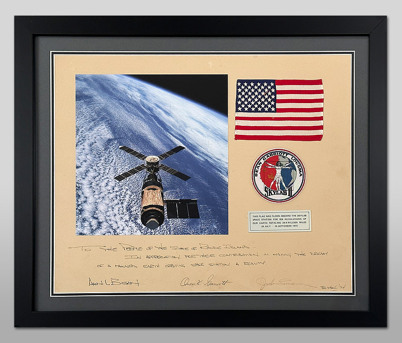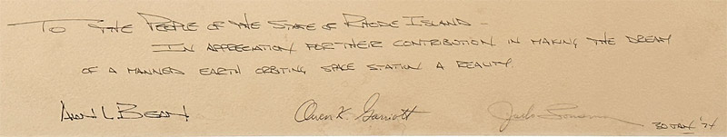 The flag is affixed to a presentation measuring 20x16 inches which is hand signed by Skylab II astronauts, Alan Bean, Owen Garriot and Jack Lousma. The presentation also has a hand written inscription by Alan Bean which reads, "TO THE PEOPLE OF THE STATE OF RHODE ISLAND - IN APPRECIATION FOR THEIR CONTRIBUTION IN MAKING THE DREAM OF A MANNED EARTH ORBITING SPACE STATION A REALITY"