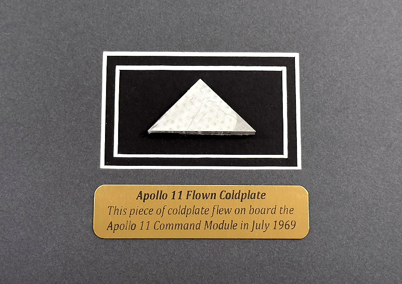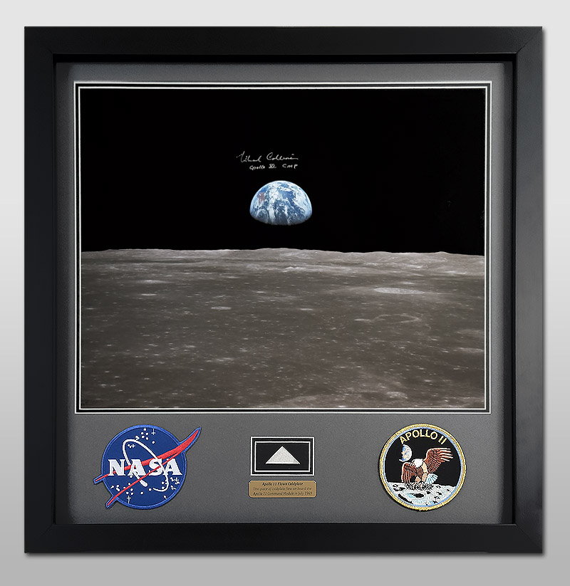 It was framed using archival materials below a stunning 20x16 inch photo of Earthrise captured during the Apollo 11 mission, hand signed by Michael Collins with 'Apollo XI CMP' and a brass plaque which reads, "Apollo 11 Flown Coldplate - This piece of coldplate flew on board the Apollo 11 Command Module in July 1969"