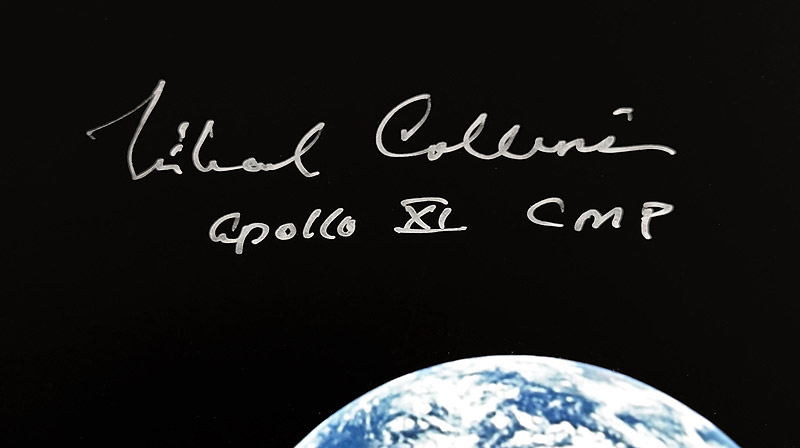 This framed presentation contains a 42mm wide x 21mm high (1.6 inch x .8 inch) piece of the coldplate shielding that protected the Apollo 11 Command Module systems from the extremes of temperature and radiation during their mission to the Moon in July 1969. Framed below a stunning 20x16 inch Earthrise photo hand signed by Apollo 11 CMP, Michael Collins.