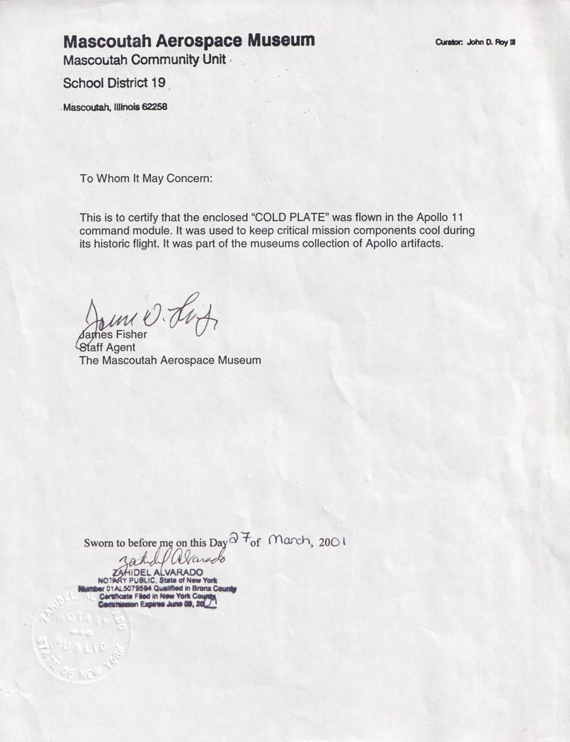 The Flown Coldplate piece was cut from a larger section of Coldplate sheilding which was originally belonged to the Mascoutah Aerospace Museum.