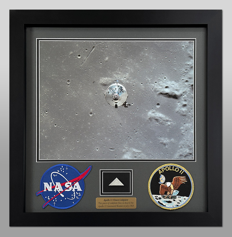 It was framed using archival materials below a stunning 14x11 inch photo of the Apollo 11 Command Module in lunar orbit and a brass plaque which reads, "Apollo 11 Flown Coldplate - This piece of coldplate flew on board the Apollo 11 Command Module in July 1969"