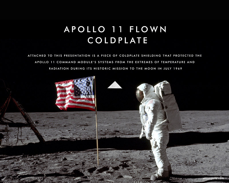 This 10x8 presentation contains a 0.5 inch x 0.3 inch high (15mm x 9mm) piece of the coldplate shielding that protected the Apollo 11 Command Module systems from the extremes of temperature and radiation during their mission to the Moon in July 1969. The piece was cut from a larger section of Coldplate sheilding which was originally belonged to the Mascoutah Aerospace Museum.