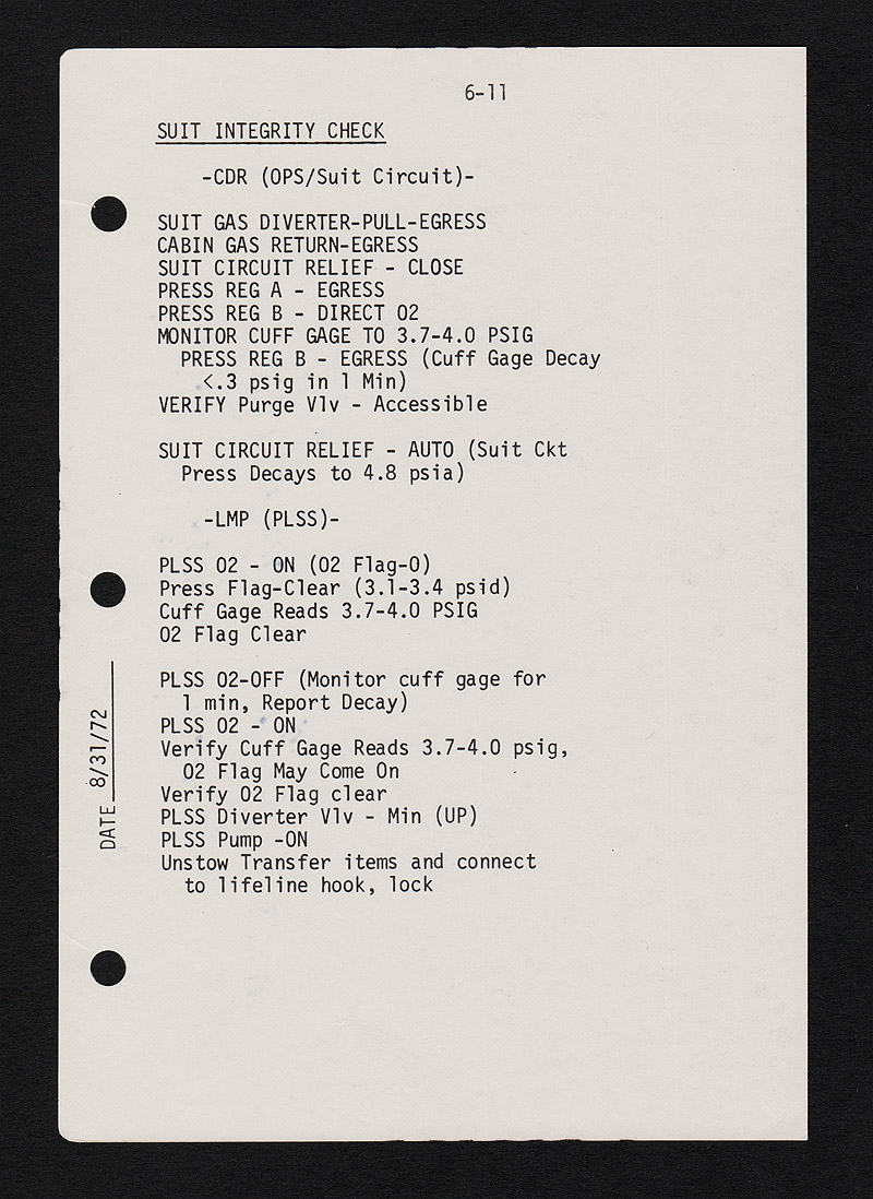 The rear side - (not visible but a print of rear side is included) - Page 6-11 deals with Suit Integrity Checks for the Commander's OPS (Oxygen Purge System) and the Lunar Module Pilot's PLSS (Portable Life Support System)