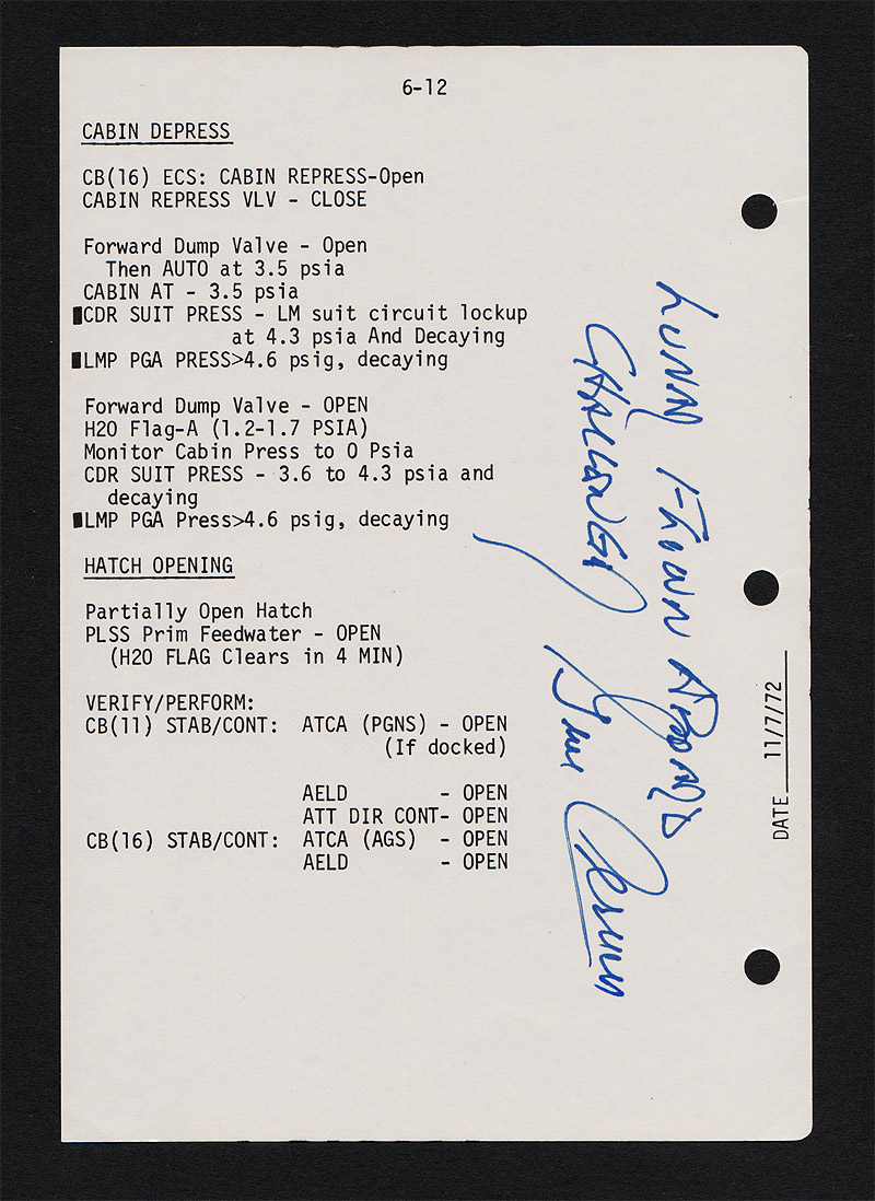 This particular page (6-12) deals with 'Cabin Depress' followed by 'Hatch Opening'. This side has been hand signed and inscribed by Apollo 17 Commander - Gene Cernan, "Lunar Flown Aboard Challenger - Gene Cernan"