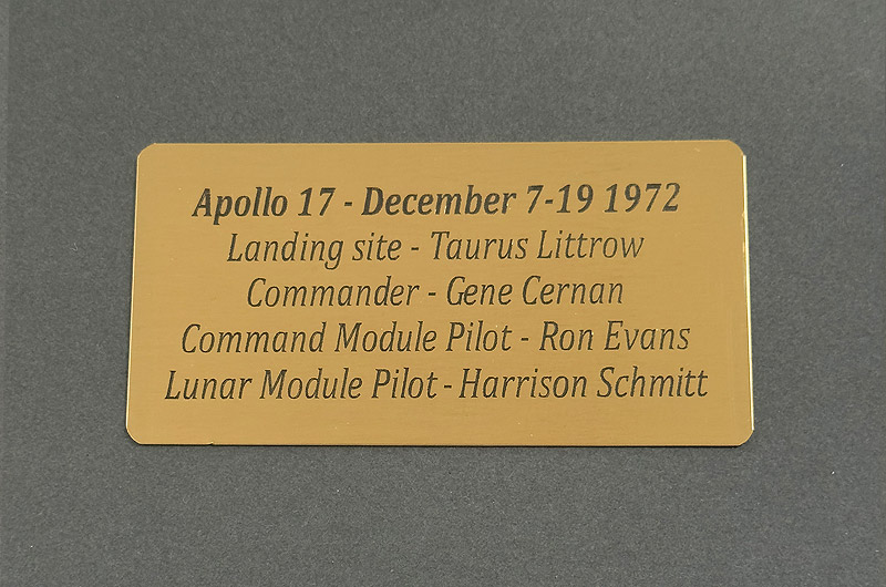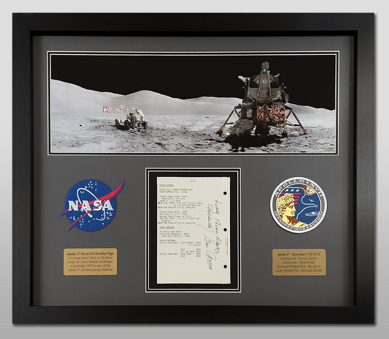 Framed using archival materials, UV acrylic glazing, with a 23x8 inch Moonpans Apollo 17 panoramic print of the Apollo 17 Lunar Module at Taurus Littrow (where this page stayed for 3 days), along with two 4 inch AB Emblems Patches and 2 brass plaques