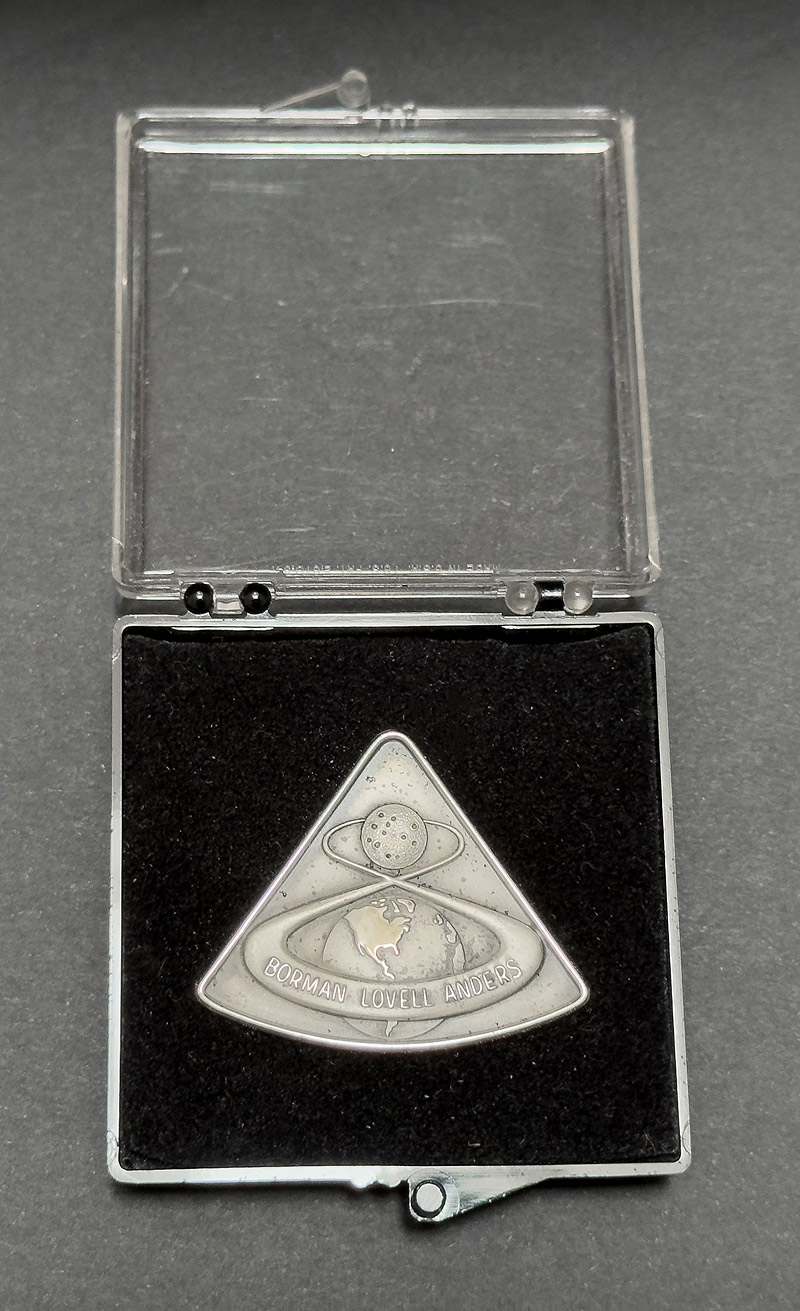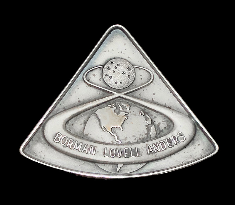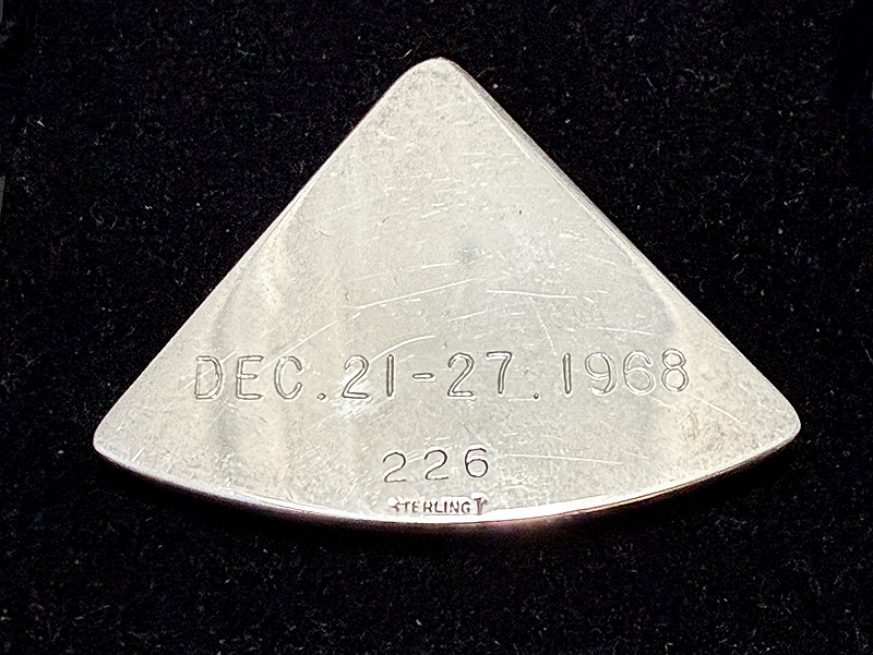 Sterling Silver measuring 1.5 x 1.25 inches front side has a raised design of the Apollo 8 insignia, the rear side has the mission dates engraved "DEC 21 - 27 1968" plus the edition number "226" and "Sterling" hallmark