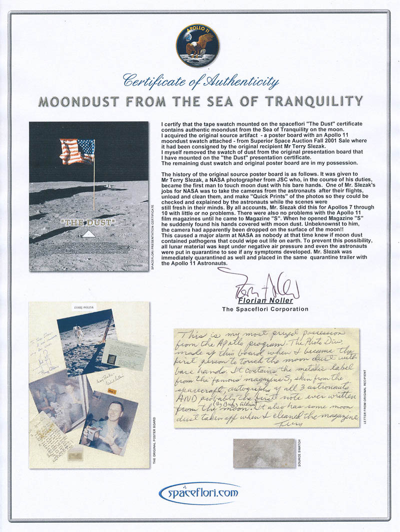 A COA from Florian Noller that comes with the presentation reads in part: “I acquired the original source artifact-a poster board with an Apollo 11 moondust swatch attached-from the Superior Space Auction Fall 2001…The history of the original source poster board is as follows. It was given to Mr. Terry Slezak, a NASA photographer from JSC who, in the course of his duties became the first man to touch moon dust with his bare hands. One of Mr. Slezak’s jobs for NASA was to take the cameras from the astronauts after their flights, unload, and clean them. There were no problems with the Apollo 11 film magazines until he came to Magazine ‘S.’ When he opened Magazine ‘S’ he suddenly found his hands covered in moon dust. Unbeknownst to him, the camera had apparently been dropped on the surface of the moon!…Mr. Slezak was immediately quarantined as well and placed in the same quarantine trailer with the Apollo 11 astronauts.”