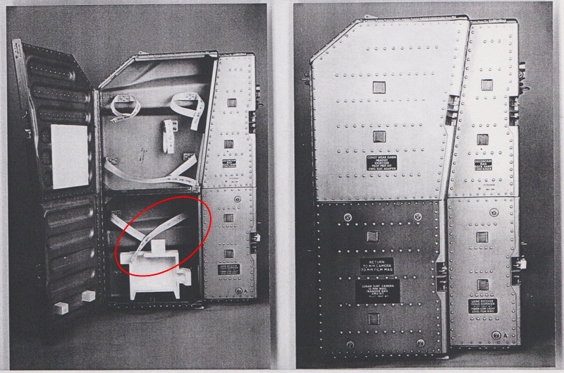 The A8 locker (Part #V36-787084) was mounted on the aft bulkhead of the Command Module below the crew couches. This locker had four storage areas with outer doors labels which included: Return 70mm Camera, 70mm Film Mag, Lunar Surf Camera, 16mm Mag, Transfer Bag, Decontam Bag, Rock Samp Container, Headset, Exerciser, and Pilot Preference Kit.