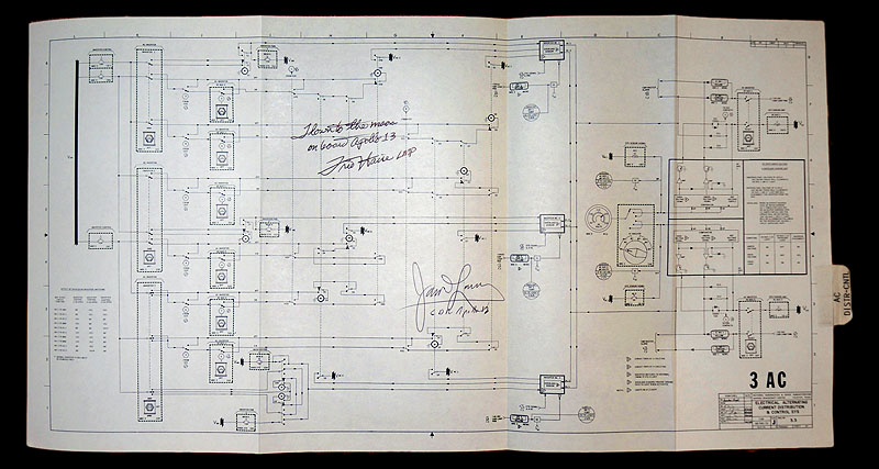 This schematic measuring 20 x 10.5 inches flew on one of the key missions in Space history, the infamous Apollo 13. It was carried in the Command Module, Odyssey and details the Alternating Current Electrical Systems of the Command and Service Module.