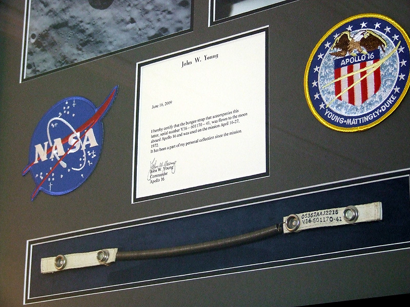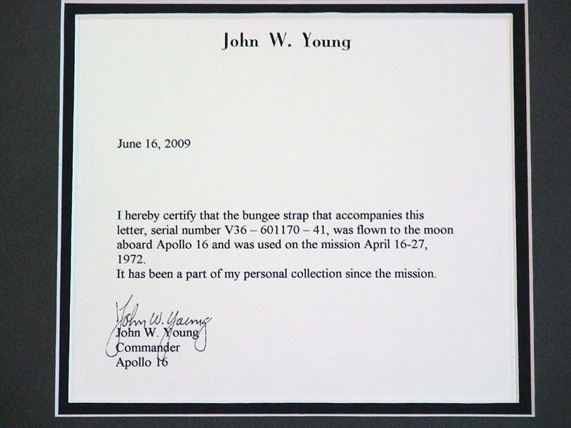 The bungee comes from the personal collection of Apollo 16 Commander, John Young, who has also provided a signed COA which has been matted into the presentation (see photos)