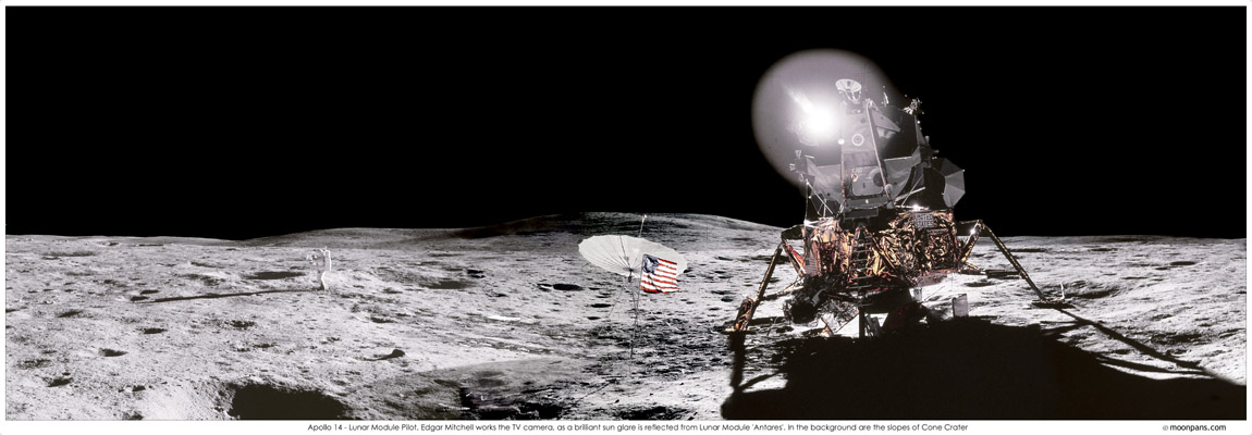 Shows Lunar Module Antares with a sun glare reflecting off the roof