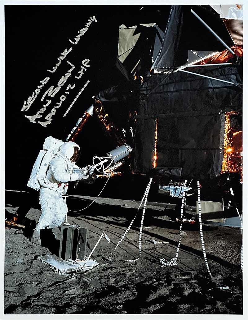 Large format 11x14 inch photo showing Apollo 12 astronaut Alan Bean extracting the fuel element of a Radioisotope Thermoelectric Generator (RTG) from storage on the lunar module on the Moon. Hand signed by Bean in bold silver pen, "Second Lunar Landing - Alan Bean - Apollo 12 LMP"