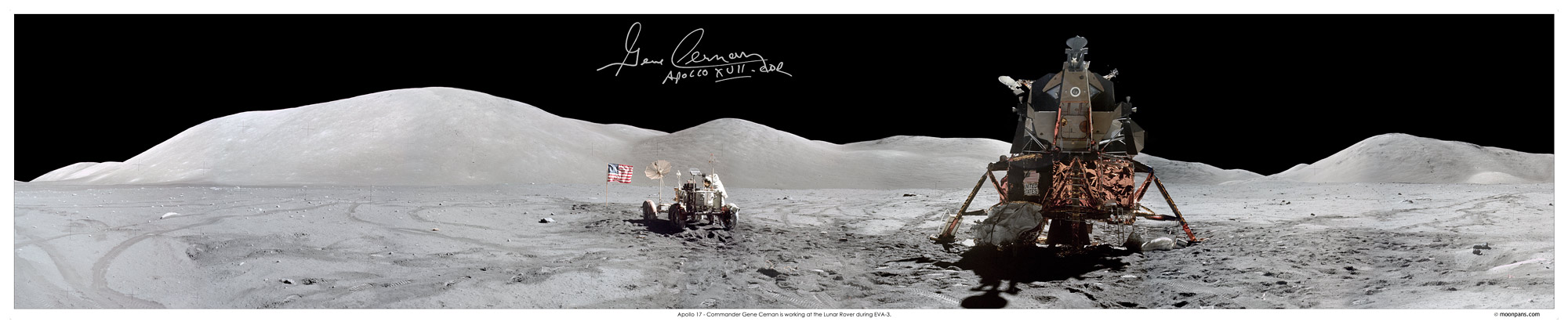 Stunning 40x8 inch panorama showing Cernan on the Moon beside the Lunar Rover on EVA-3, hand signed by Cernan in silver pen,"Gene Cernan Apollo XVII - CDR"