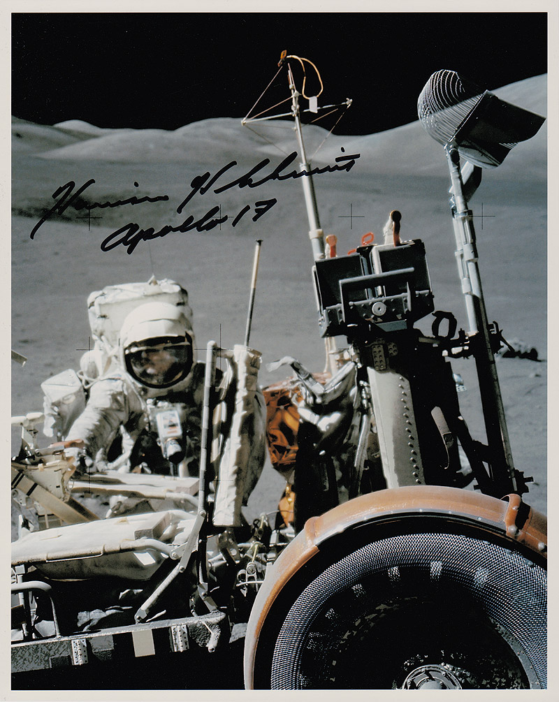 This stunning 8x10 inch photo showing Harrison Schmitt working at the Apollo 17 Lunar Rover. Hand signed by Schmitt in black pen, "Harrison Schmitt Apollo 17"