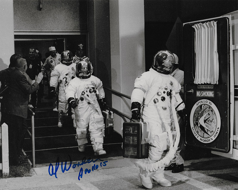 10x8 inch photo showing the Apollo 15 Walkout. Hand signed by Worden in blue pen with 'Apollo 15' .