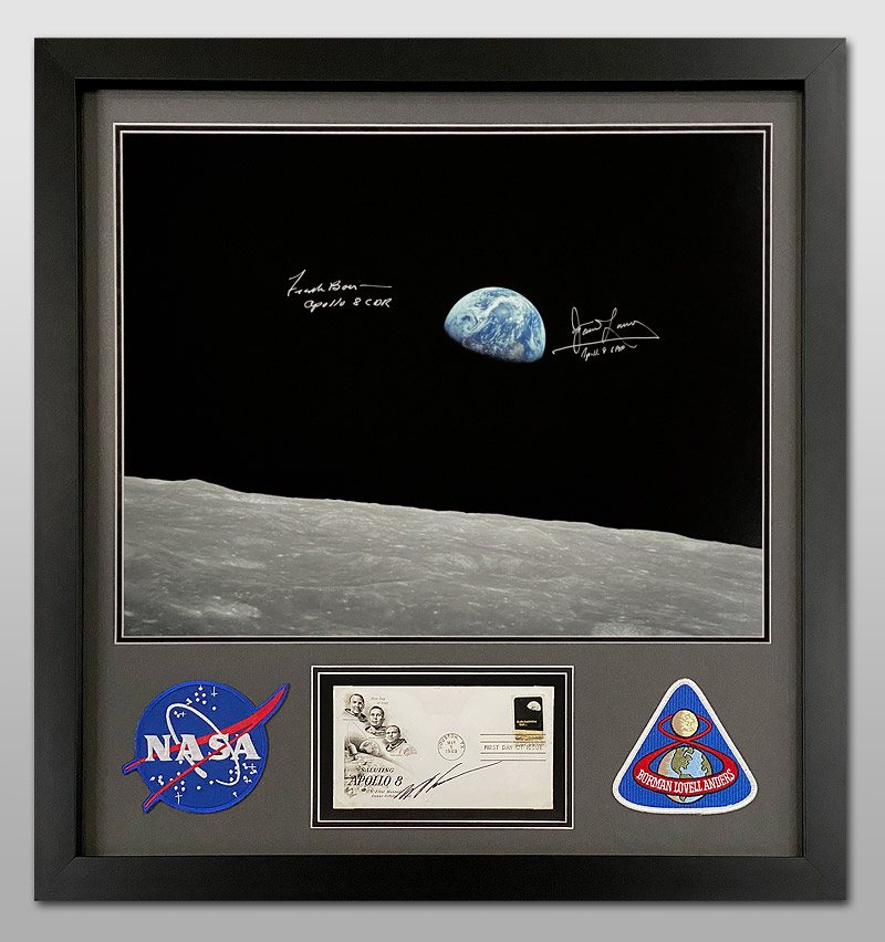 A magnificent large framed piece featuring signatures from all 3 Apollo 8 Crew members, Frank Borman, Jim Lovell and Bill Anders. The Borman and Lovell are on a 20x16 inch photo of the famous Earthrise photo. The Anders is on a matted Apollo 8 First Day Cover cancelled on May 5th 1969 - the date that the Apollo 8 'In The Beginning' stamp was released.