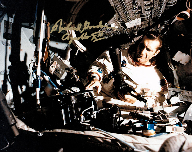 10x8 photo of Apollo 12 CMP Richard Gordon in the Command Module simulator, hand signed by Gordon in gold pen, "Richard Gordon Apollo XII".