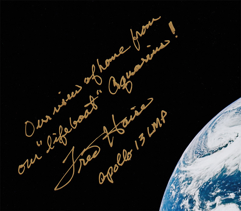 Stunning 8x10 inch glossy Apollo 13 Earth photo, hand signed by Fred Haise in gold pen, 'Our view of home from our "lifeboat" Aquarius! Fred Haise - Apollo 13 LMP'