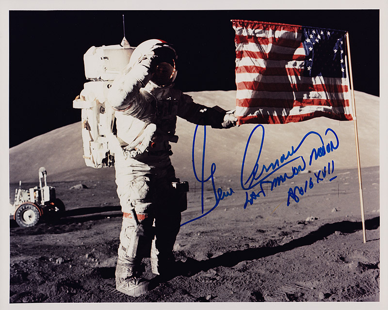 Gene Cernan saluting the US flag hand signed with "Last Man On Moon"