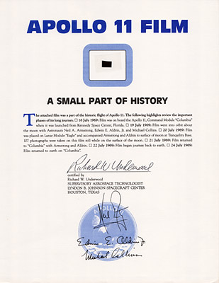 Contains a 10 mm wide section of camera film used by Neil Armstrong and Buzz Aldrin on the Lunar Surface