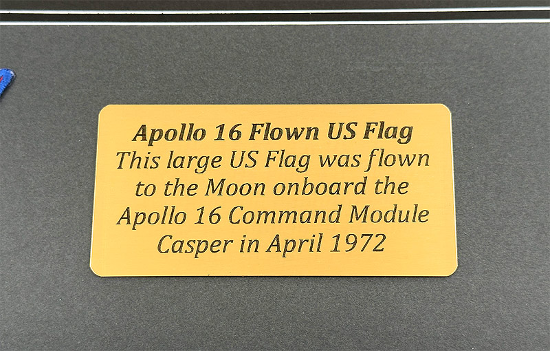 It has been archivally framed along with 2 AB Emblems 3 inch patches and a brass plaque. The plaque reads, "Apollo 16 Flown US Flag - The Large US Flag was flown to Moon onboard the Apollo 16 Command Module Casper in April 1972"