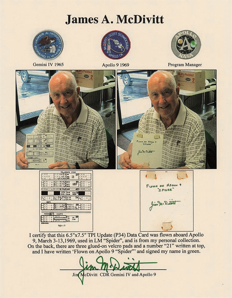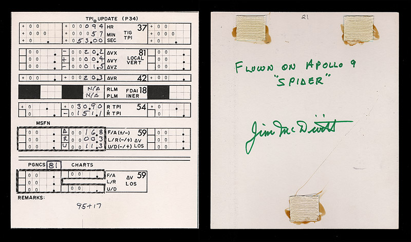 This particular Lunar Module cue card is entitled "TPI 0 UPDATE (P34)" (Terminal Phase Initiation) The purpose of TPI was to begin the final approach and docking procedures necessary to dock the Command Module and the Lunar Module in Earth orbit after the first free flight of the LM. It comes from McDivitt's collection, and includes a McDivitt hand signed LOA