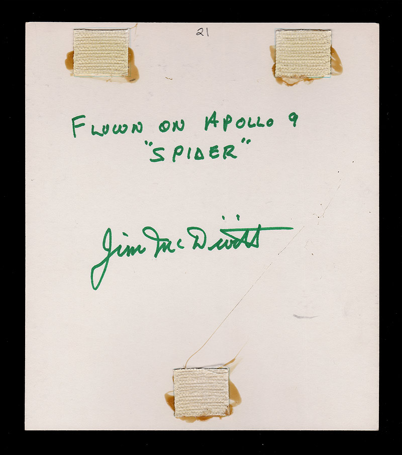 The rear side with McDivitt inscription "FLOWN ON APOLLO 9 "SPIDER" - Jim McDivitt" and 3 tabs of Velcro