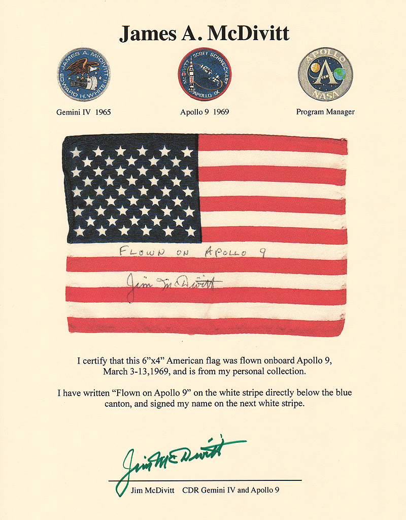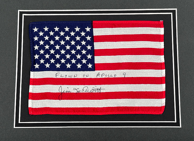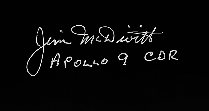 The flag was hand signed and inscribed by McDivitt with, “Flown on Apollo 9 - Jim McDivitt,”. The 20x16 inch photo shows the Apollo 9 Lunar Module ascent stage, in Earth orbit, piloted by Jim McDivitt and Rusty Schweickart hand signed by McDivitt in silver pen "Jim McDivitt Apollo 9 CDR"