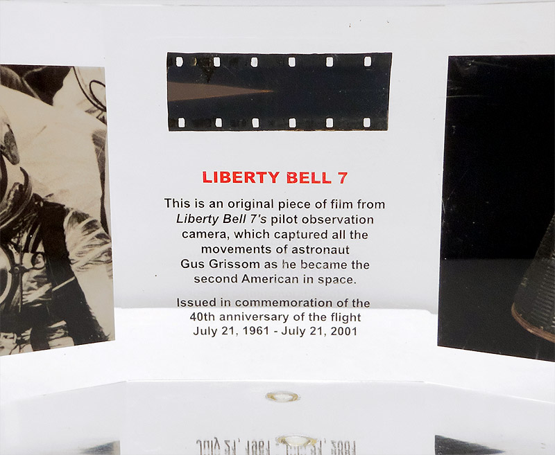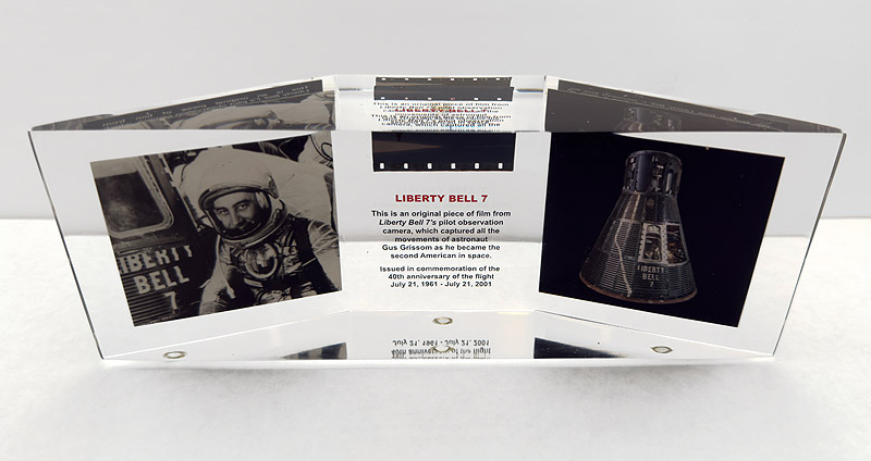 Flown original piece of film from Gus Grissom’s Liberty Bell 7 Mercury spacecraft, issued as a limited edition in commemoration of the 40th anniversary of the flight, numbered 208/1000. The piece of film measures approximately 1.5" x .5" and is presented inside an 8.25" x 3" x 1.75" Lucite display with an image of Grissom, the spacecraft, and printed information about the pilot observation camera. In excellent condition.