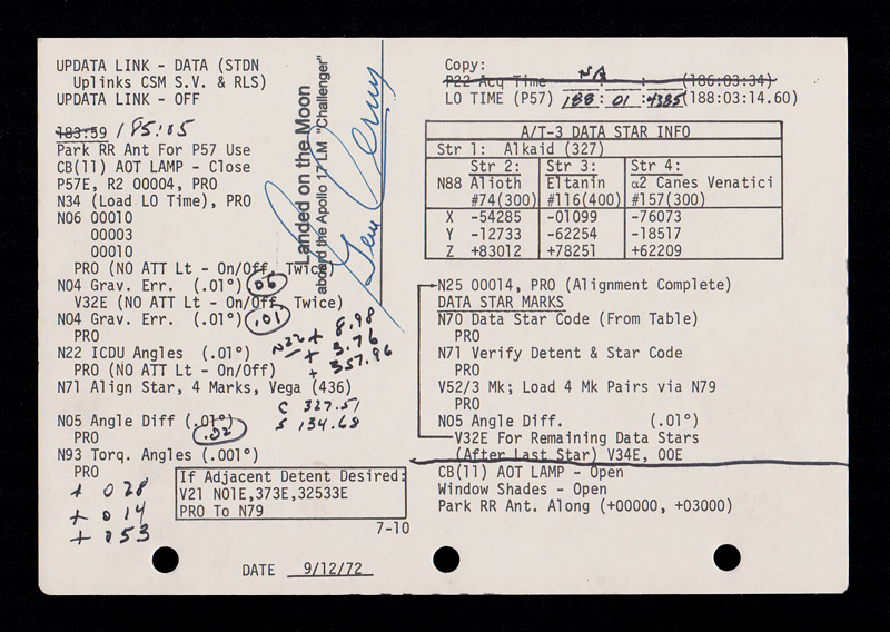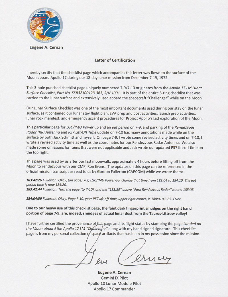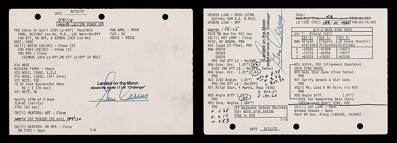 This Lunar Module Checklist Page was flown and used on the Lunar Surface during the Apollo 17 mission to the Moon and has smudges of Lunar Dust. It also has hand written annotations made while inside the LM on the lunar surface