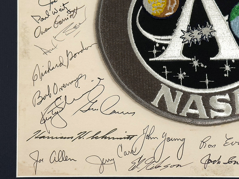 The complete list of signers: Buzz Aldrin, Joseph Allen, Alan Bean, Frank Borman, Vance Brand, Gerald Carr, Gene Cernan, Michael Collins, Gordon Cooper, Walter Cunningham, Charlie Duke, Joe Engle, Ronald Evans, Owen Garriott, Edward Gibson, Fred Haise, Henry "Hank" Hartsfield, Karl Henize, Don Lind, Jack Lousma, James Lovell, Ken Mattingly, Bruce McCandless, James McDivitt, Edgar Mitchell, Story Musgrave, Robert Overmyer, Robert Parker, Donald Peterson, William Pogue, Stuart Roosa, Walter "Wally" Schirra, Harrison Schmitt, Russell "Rusty" Schweickart, David Scott, Alan Shepard, Donald "Deke" Slayton, Thomas Stafford, Paul Weitz, Alfred Worden and John Young.
