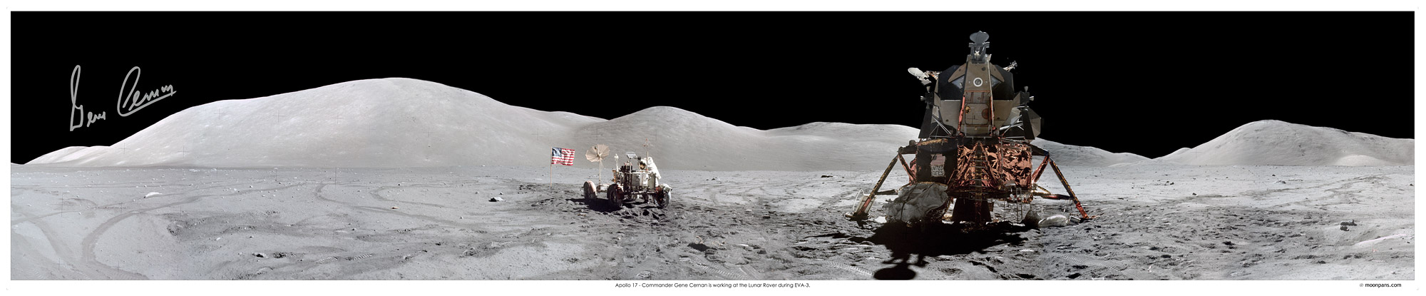 Stunning 40x8 inch panorama showing Cernan on the Moon beside the Lunar Rover, hand signed by Cernan in silver pen.