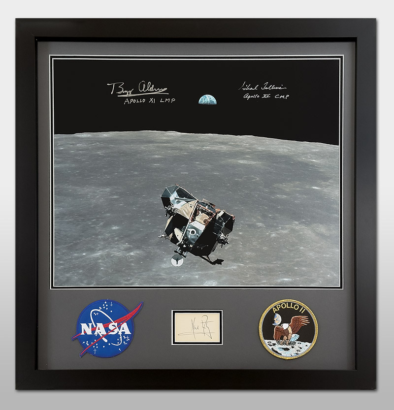 A magnificent large framed piece featuring signatures from all 3 Apollo 11 Crew members, Neil Armstrong, Buzz Aldrin and Michael Collins. The Armstrong is on an off white card and the Aldrin and Collins are on a 20x16 inch photo of the famous shot of the LM ascent stage returning from the historic first lunar landing just as the Earth rises in the background.