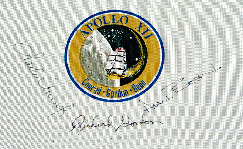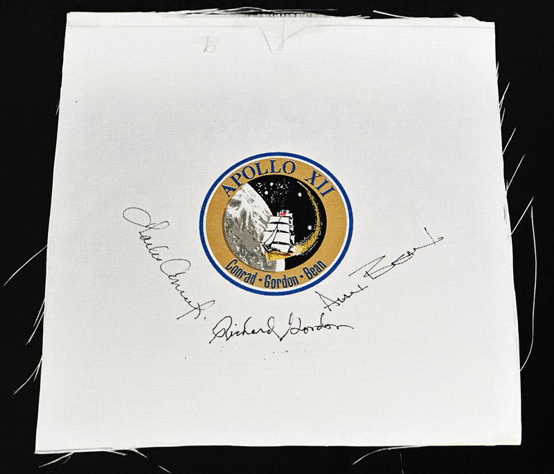 9 x 9 inch original Apollo 12 Beta Cloth Patch, hand signed in black pen by Charles Conrad, Richard Gordon Apollo, and Alan Bean.