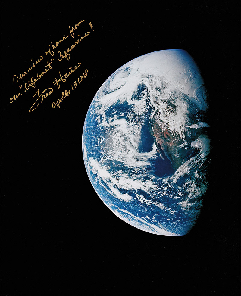 Stunning 8x10 inch glossy Apollo 13 Earth photo, hand signed by Fred Haise in gold pen, 'Our view of home from our "lifeboat" Aquarius! Fred Haise - Apollo 13 LMP'
