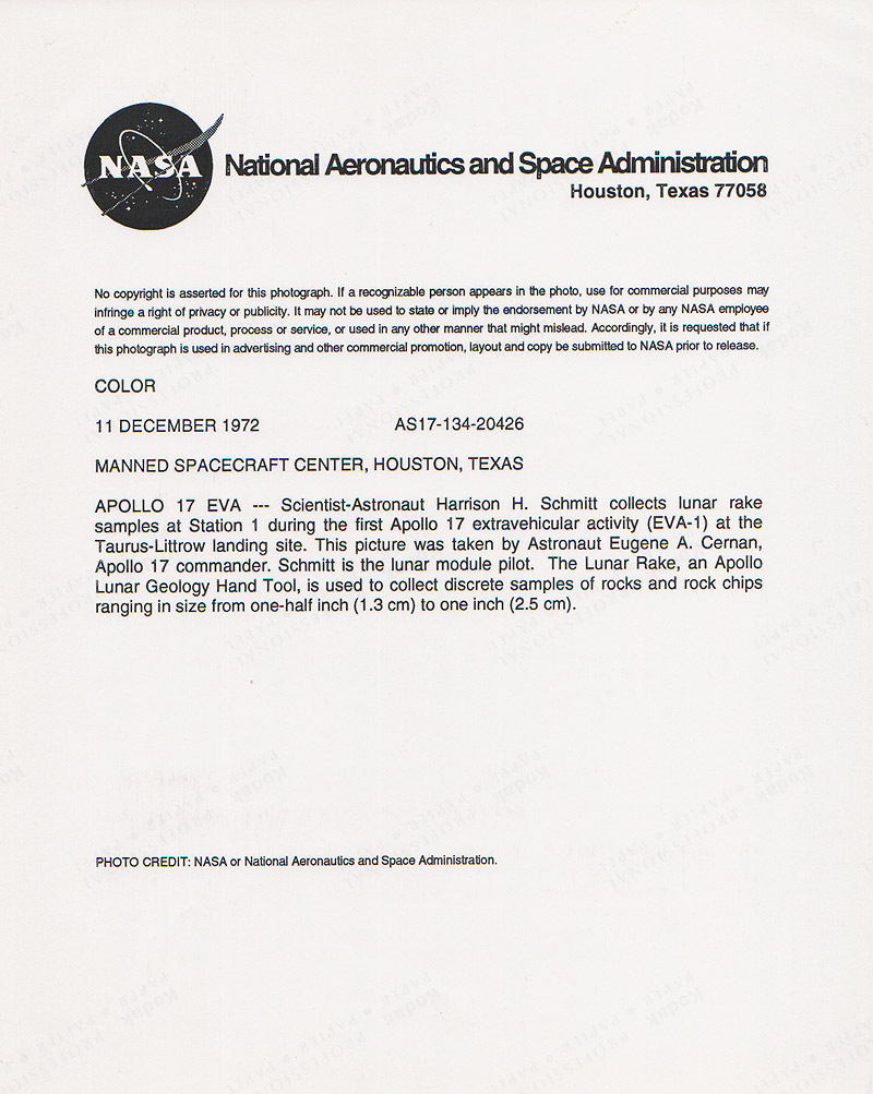 Very good condition with a subtle bend, top left above Schmitt's PLSS. Comes with Moonpans COA