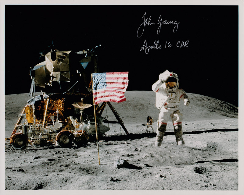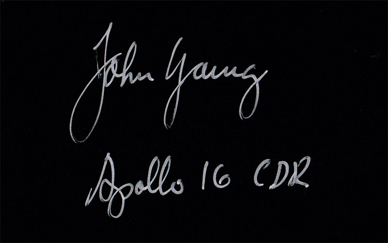Hand signed with silver pen, by John Young with "Apollo 16 CDR"